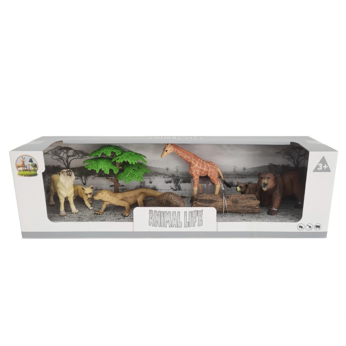 Setet innehåller bl.a plastfigurer av en giraff, en björn med en björnunge, ett träd, en trädstam, en ödla och ett bältdjur. Perfekt för både lek och lärande.