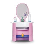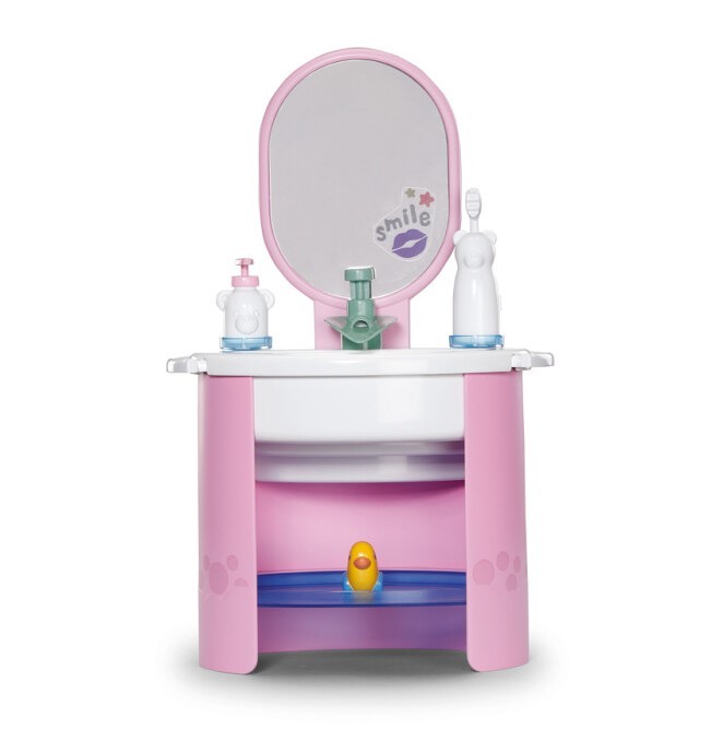 Handfatet är utrustat med en mekanisk vattenpump som ger verkligt rinnande vatten från kranen, så att barn kan leka som riktiga dockföräldrar. Den lilla tandborsten vibrerar som en riktig elektrisk tandborste utan batterier. Inkluderar också en tvålpump och ett ark med klistermärken för personlig dekoration.