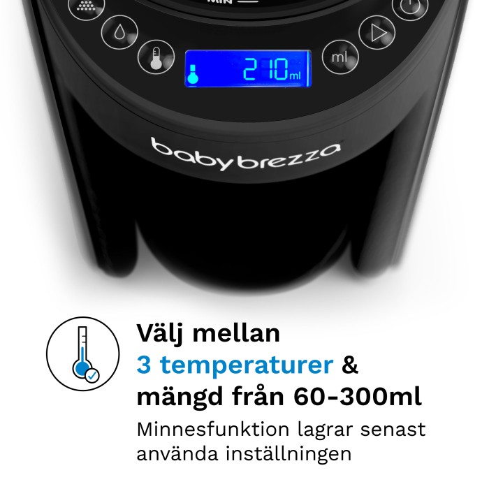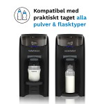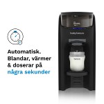 Välj genom den digitala kontrollpanelen vilken mängd vatten du vill ha till vällingen, maskinen doserar sedan vatten och pulver, därefter blandar maskinen i ordning vällingen/ersättningen till ditt barn på några få sekunder. Det kan inte bli enklare att göra i ordning en flaska välling!