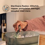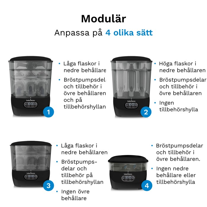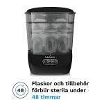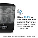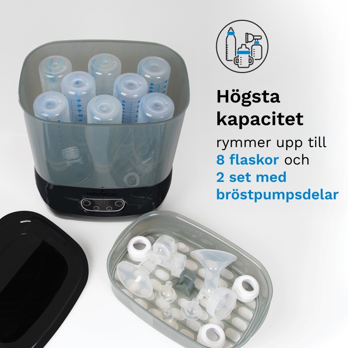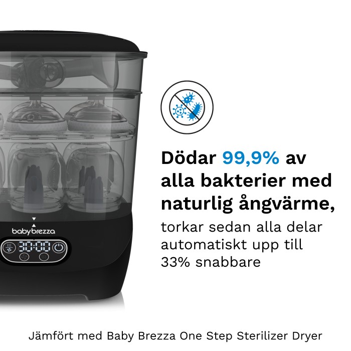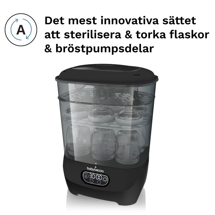 Baby Brezzas sterilisator är i en klass för sig, den steriliserar och torkar alla typer av barnflaskor, bröstpumpsdelar, nappar och tillbehör helt automatiskt.