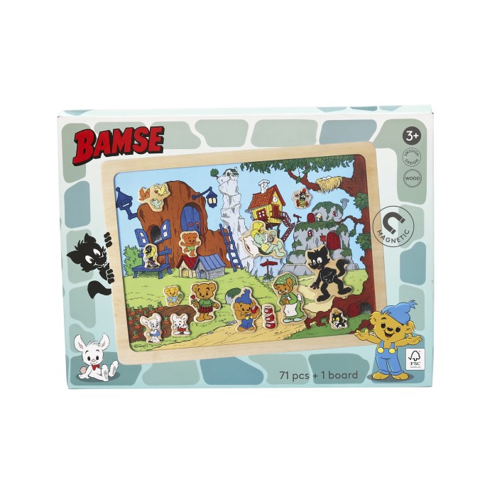 Denna dubbelsidiga magnettavla från Bamse bjuder in till både lek och lärande! På den svarta sidan kan barnen skapa ord med bokstäver, medan den andra sidan ger utrymme för lek med figurer från Bamses värld. Vilka av Bamses vänner dyker upp i Bamsebyn idag?