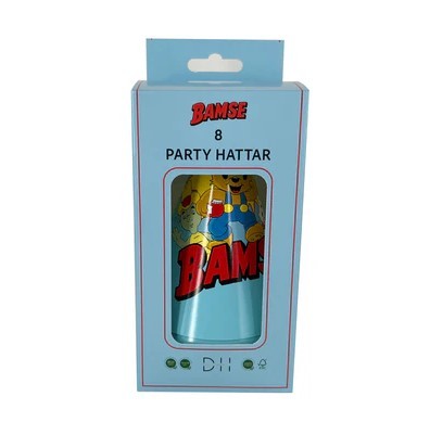 Dessa festliga papperhattar har motiv av den älskade Bamse, skapad av Rune Andréasson, och kommer med en praktisk gummisnodd för enkelt användande. Perfekta för kalaset eller födelsedagsfesten. Förpackningen innehåller 8 st hattar, varje med måtten 8,5x12,8 cm. Låt alla barn känna sig som en del av Bamses värld och göra kalaset ännu roligare!