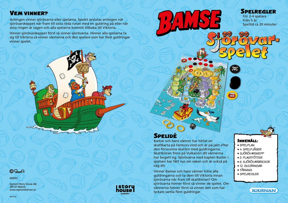 Målet är att hitta de försvunna guldringarna på Vulkanön innan sjörövarna, ledda av kapten Buster, hinner dit. Spelet kombinerar strategi och tur, där spelarna måste samla så många guldringar som möjligt för att vinna. Om sjörövarna når skattkistan först, vinner de spelet! Med färgglada figurer och en engagerande historia är detta spel perfekt för barn som älskar Bamse och hans vänner, och det stimulerar både samarbete och konkurrens.