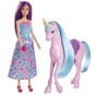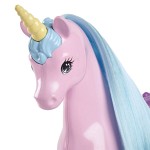 Rid in i fantastiska sagovärldar med Barbie och hennes magiska enhörning! Den glittrande enhörningen har en turkos man och svans som barnen kan borsta med den medföljande kammen, perfekt för kreativ lek. Barbie är klädd i en skimrande outfit med stjärndetaljer och prismamönster som förstärker det magiska temat. Denna lekset bjuder in till oändlig fantasilek och är idealiskt för barn som älskar hästar, enhörningar och Barbie-dockor.