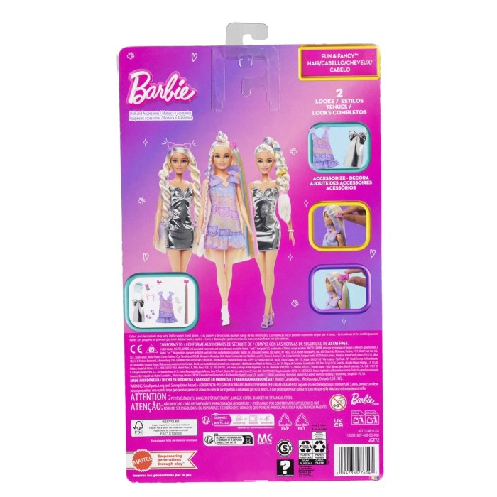 Med 21 cm extra långt, spelbart hår och 10 mode- och stylingtillbehör kan barnen utforska oändliga frisyrmöjligheter. Denna Barbie-docka kommer med en lila klänning med kattmönster samt en extra look med en silvermetallisk klänning och vita klackar. Stylingtillbehören inkluderar en regnbågsförlängning, pannband med kattöron, hårband och spännen.