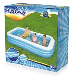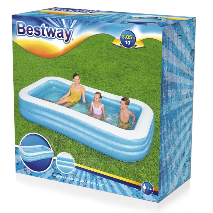 Rektangulär pool från Bestway med plats för hela familjen! Poolen är tillverkad i kraftig testad vinyl och har extra breda sidoväggar. Ett ordentligt reparationskit ingår.