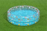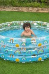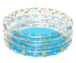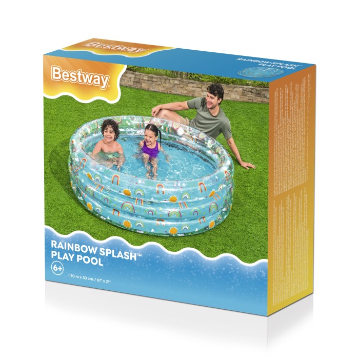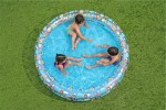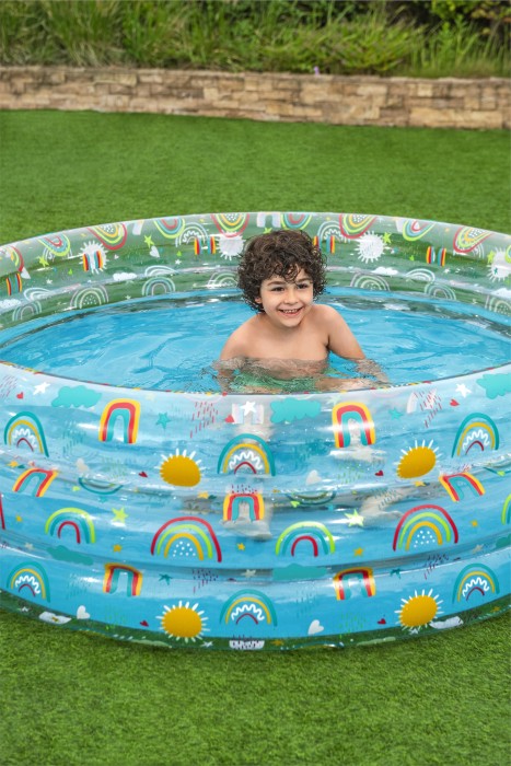 Treringad pool från Bestway med färgglatt delvis genomskinligt motiv som svalkar på varma sommardagar. De tre ringarna gör poolen stabil och den bärbara strukturen gör den lätt att blåsa upp och ta undan när badstunden är över. Lagningslapp ingår.