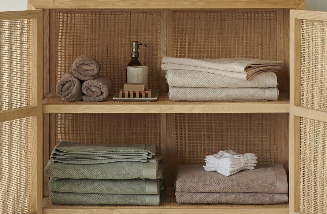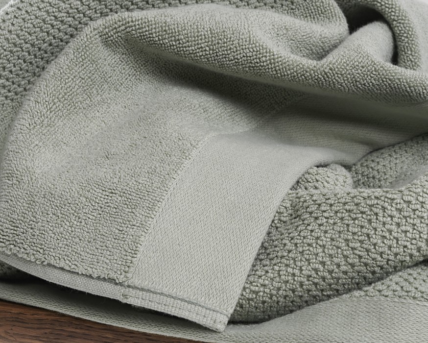 Mjuka och sköna handdukar i bomullsfrotté från Borganäs med en fin struktur, kontrasterande slät bård samt en bred kant nedtill och med hängare på kortsidorna