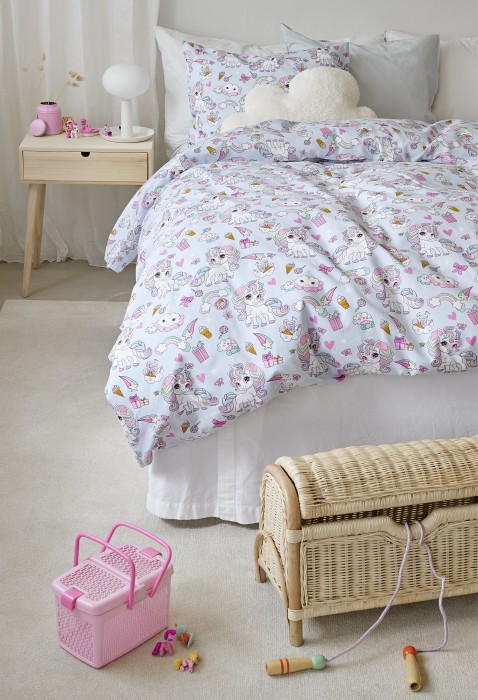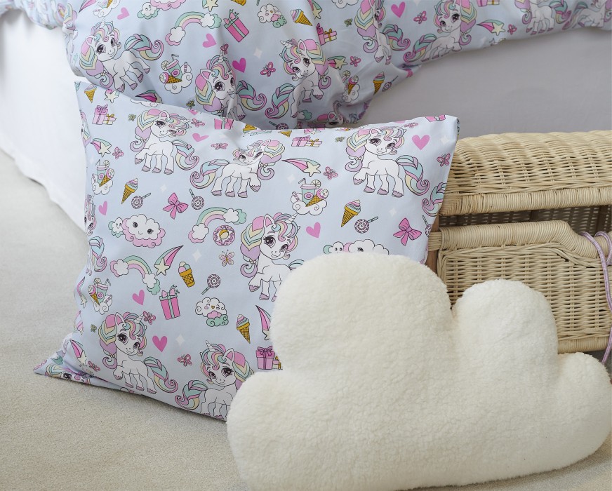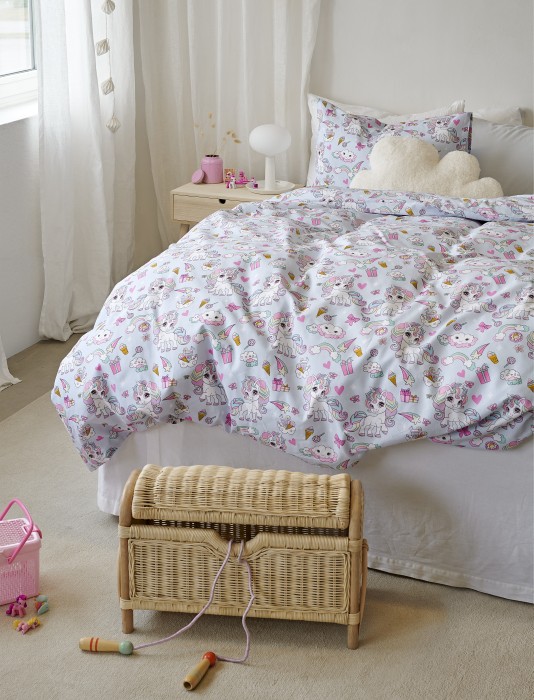 Påslakanset med enhörningsmönster från Borganäs. Setet består av ett påslakan och ett örngott i mjuk och skön bomullskvalitet.