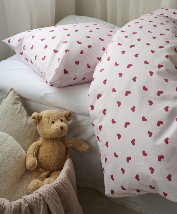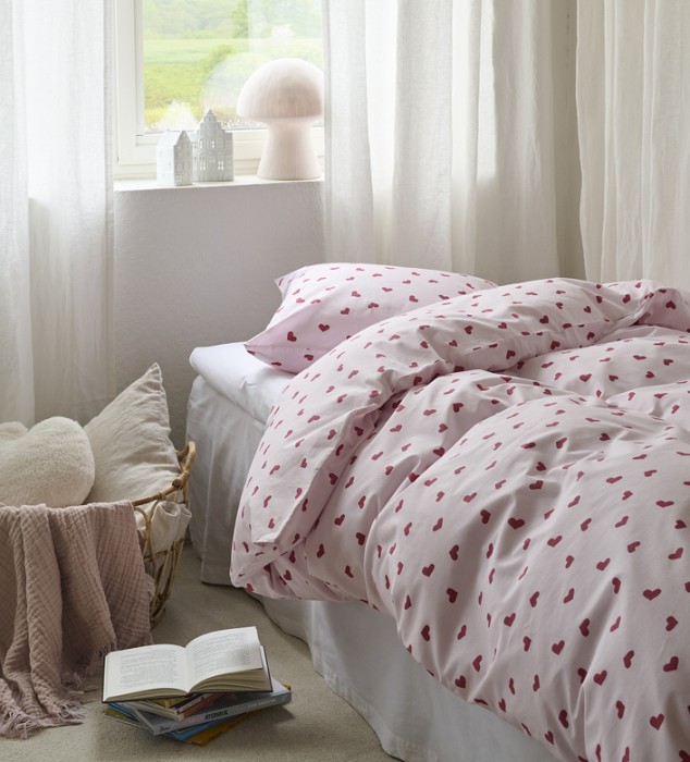 Ge sovrummet en lekfull och romantisk touch med Borganäs bäddset med hjärtan.