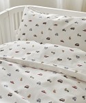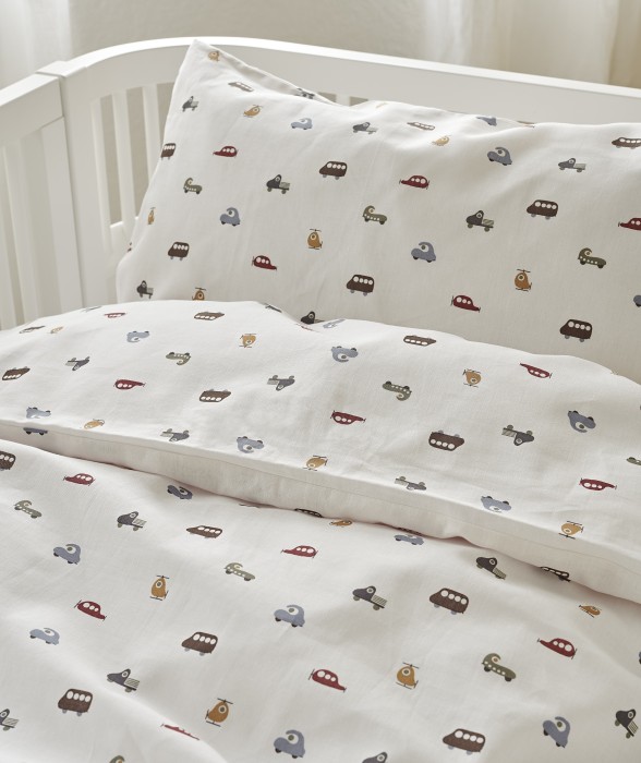 Bäddsetet är tillverkat i skön bomullskvalitet och har ett tryckt mönster med olika fordon. Påslakanet har hörnhål för att förenkla bäddningen och örngottet har kuvertöppning.