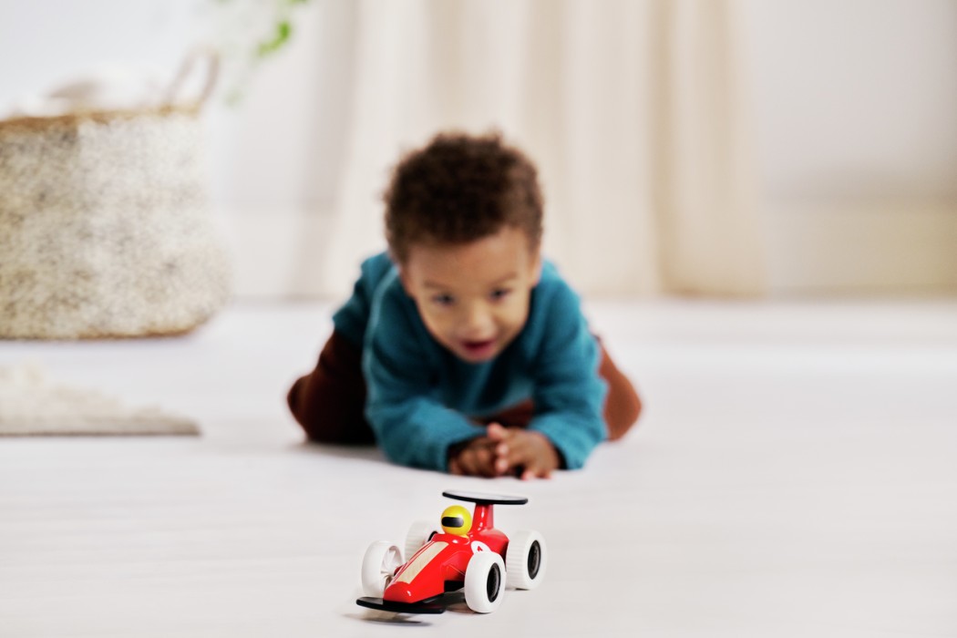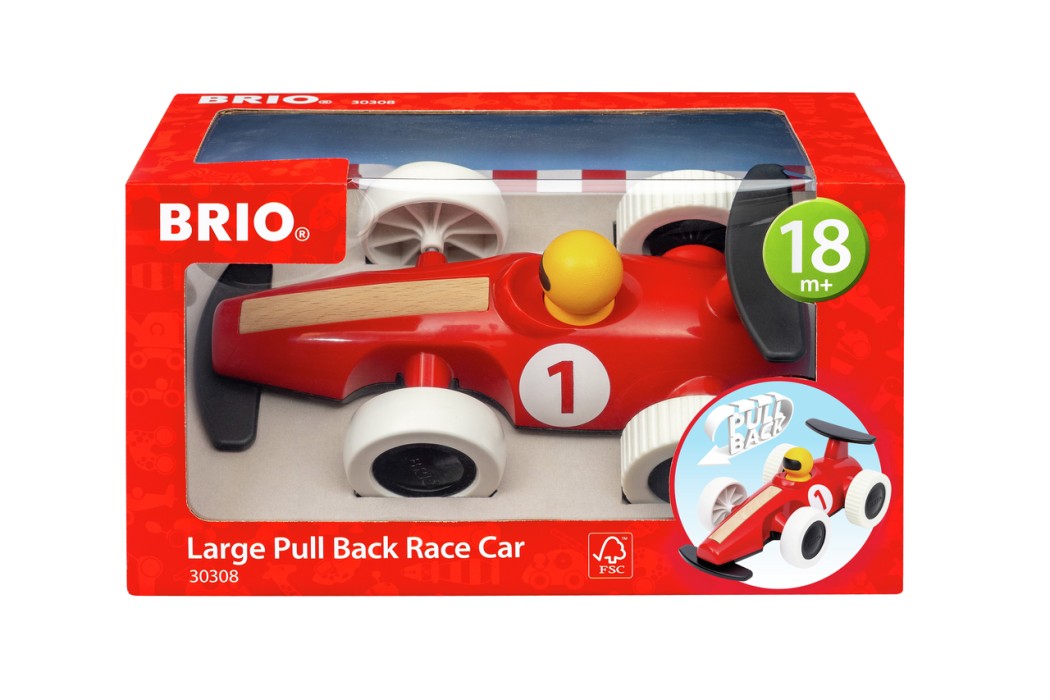 Den klassiska BRIO-racerbilen i en större modell med rolig pull back-funktion! Racerbilen är perfekt för yngre barn som lär sig att krypa och gå.