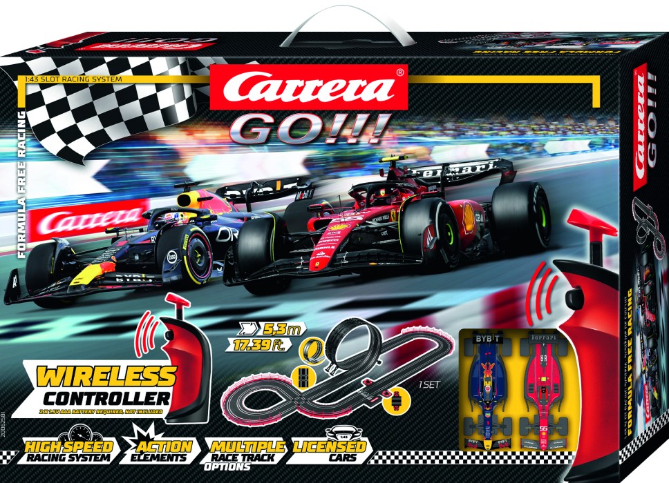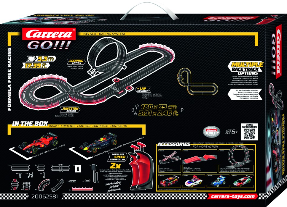 Setet levereras med trådlösa turboladdade handkontroller och ett power pack för banan. Bilarna som ingår i setet är i skala 1:43 och har tillverkats med största möjliga omsorg om detaljerna. Setet innehåller även varvräknare för att hålla koll på ledaren och en bana med korsning och slinga som ger ännu mer utmaning och spänning!