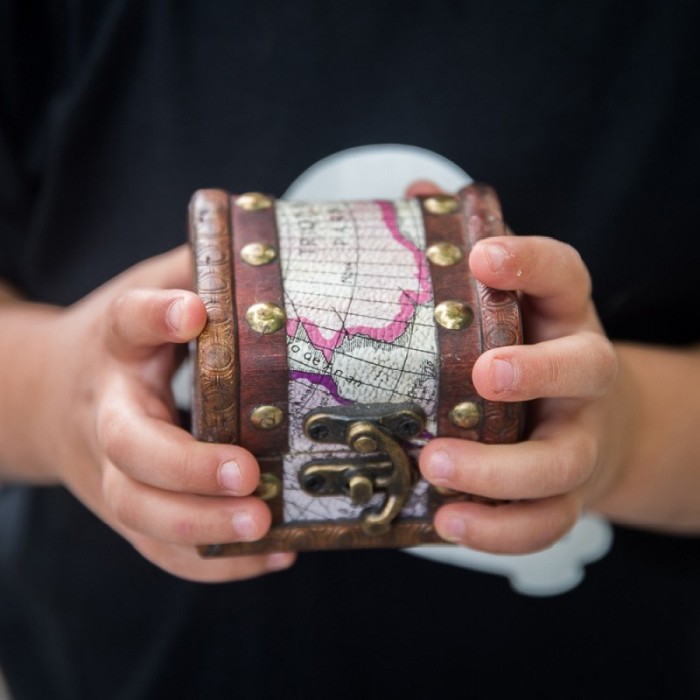 Fantastiskt detaljerad skattkista i trä, metall och konstläder med enkelt spänne. Inuti finns juveler (ca 30 st små i olika färger av plast och en stor i glas), skattkarta, och en liten sammetspåse som rymmer alla de små juvelerna eller den stora och några av de små.