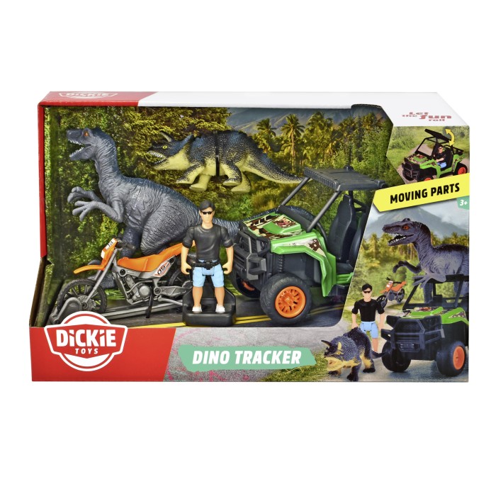 Ge dig ut på spännande äventyr med Dickie Toys dinosaurie lekset! Perfekt för alla barn som älskar både bilar och dinosaurier. Setet innehåller en UTV fyrhjuling med friktion, en motorcross, två dinosaurier och en böjbar figur – allt för att skapa roliga scenarier med dinosaurietema.