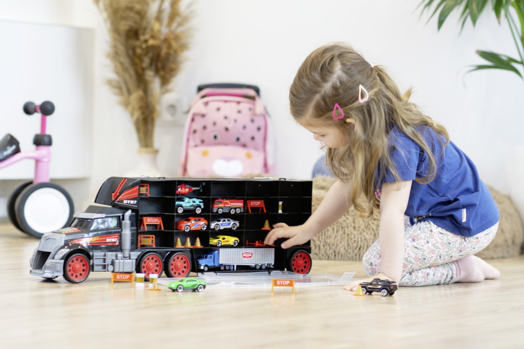 Håll ordning på leksakssamlingen med Dickie Toys gigantiska förvaringslastbil! Denna 62 cm långa lastbil är både en praktisk förvaringslösning och en spännande leksak. Med plats för många bilar och en inbyggd ramp kan barnen enkelt köra ut fordonen genom hytten och skapa roliga lekäventyr. Setet innehåller 9 metallfordon, inklusive lastbil, polisbil, brandbil, racerbilar och en helikopter, samt tillbehör som trafikkoner och vägspärrar för att återskapa autentiska vägmiljöer. Tack vare det utdragbara handtaget fungerar lastbilen även som en smidig förvaringsväska att ta med på resor eller semestern.
