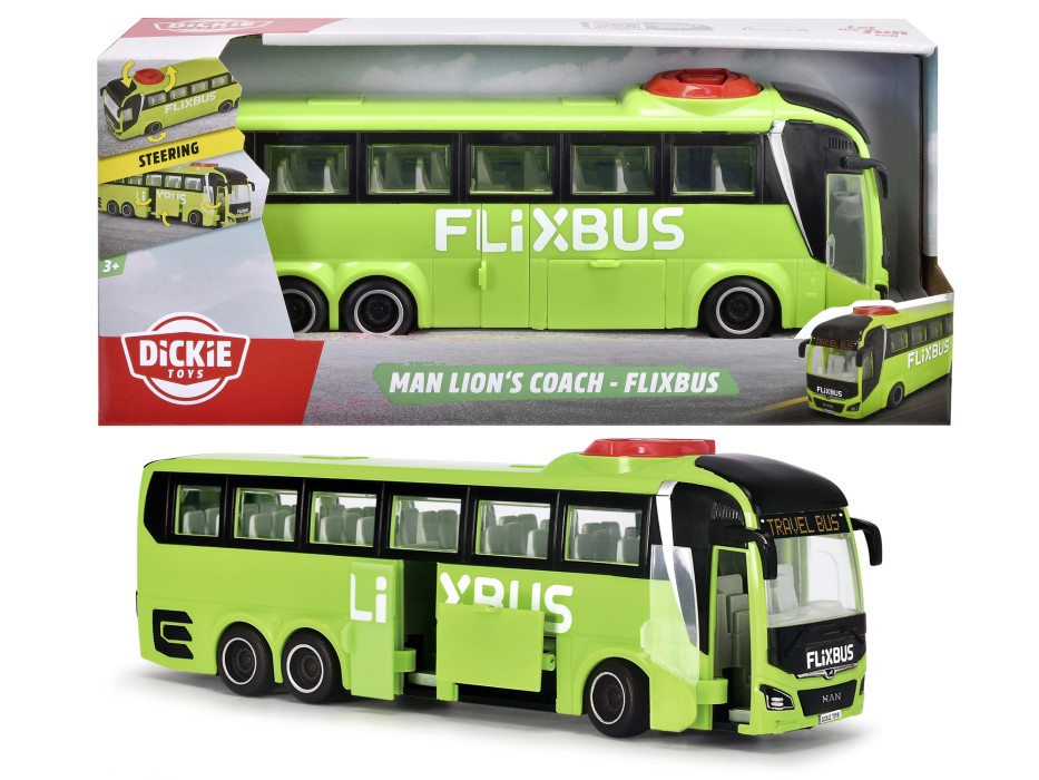 Dickie Toys MAN Lion’s Coach – Flixbus leksaksbuss med frihjul & öppningsbara dörrar