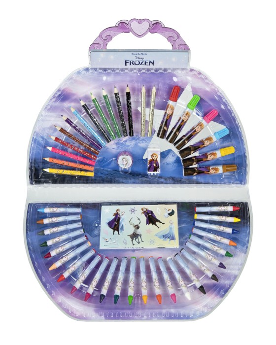 Denna halvmåneformade målarväska med Frozen-motiv är fylld med 51 fantastiska färg- och målardelar, perfekt för unga konstnärer. Med ett praktiskt handtag är väskan enkel att ta med sig, och allt innehåll hålls organiserat. Setet innehåller 12 mini färgpennor, 6 tuschpennor, 24 kritor, suddgummi, 2 mini pennor, vässare, 4 posters och ett klistermärkesark, vilket ger oändliga möjligheter för färgglad och fantasifull lek.
