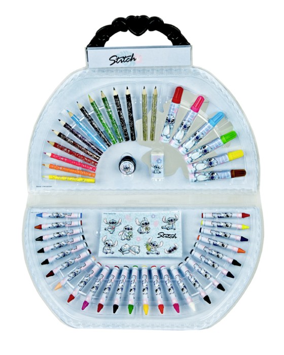 Upptäck kreativiteten med denna halvmåneformade målarväska med motiv av Disneyfiguren Stitch. Väskan innehåller hela 51 delar som passar perfekt för barn som tycker om att rita och färglägga. Med det praktiska handtaget är den lätt att bära med sig och håller alla tillbehör samlade och i ordning.