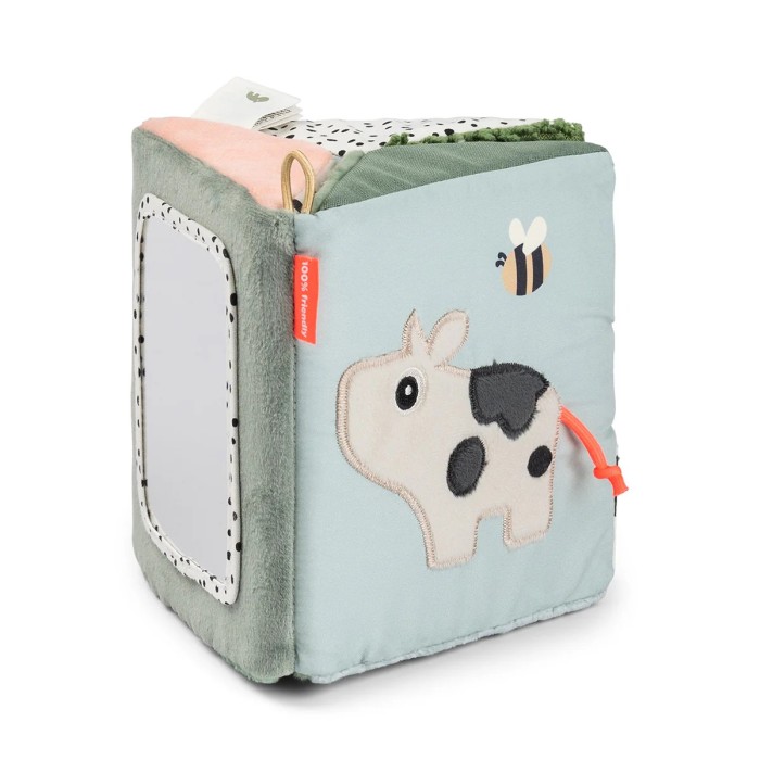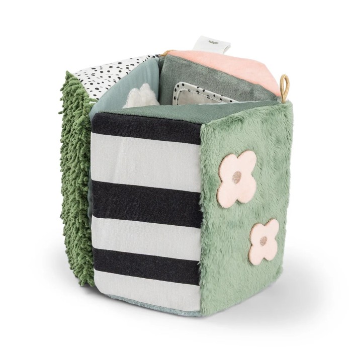 En mjuk och färgglad aktivitetskub designad för små barn som lär sig att titta, greppa och utforska. Kuben kan enkelt fällas, ställas eller hängas där ditt barn leker, vilket gör den perfekt för magträning och tidig lek.