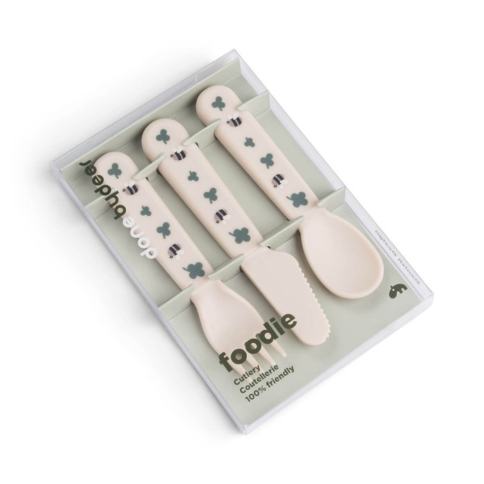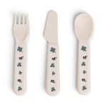 Bestick med gulligt mönster från Done by Deer, säkra och ergonomiska för små händer!