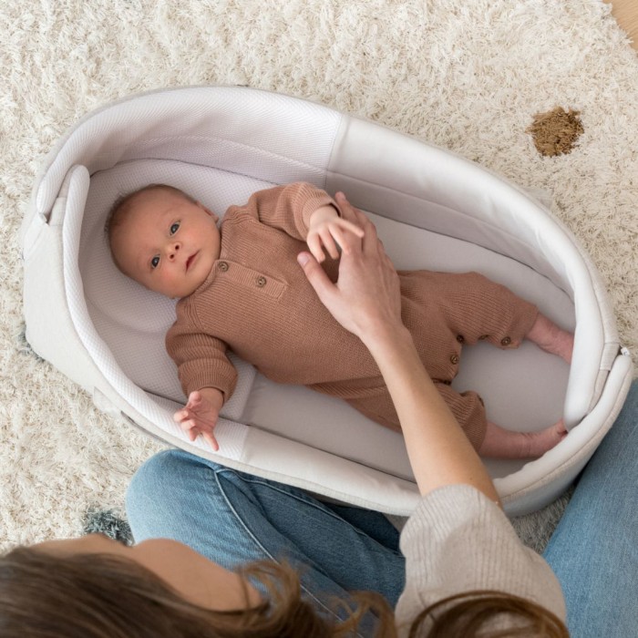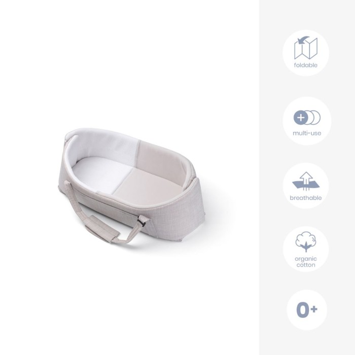 Babynestet har en 3-i-1-funktion, använd som ett babynest för hemmabruk eller resor, som en mjuklift i vagnen eller som en lekmatta på golvet genom att enkelt knäppa upp sidorna. Bärväska ingåt, förvara och transportera babynestet enkelt när det inte används.