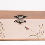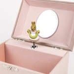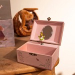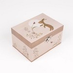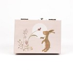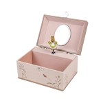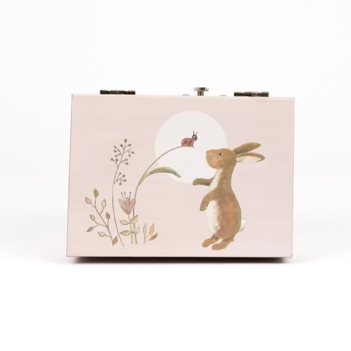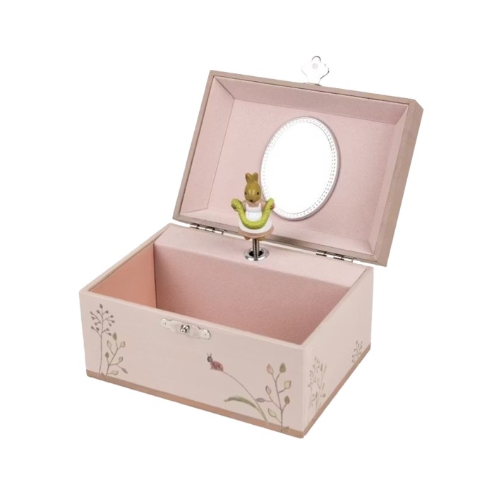 Fint smyckeskrin med spegel och en snurrande kanin som rör sig till en lugn melodi. Skrinet har en mjuk rosa insida och dekorerats med ett ljuvligt naturmotiv. Perfekt för barn som vill förvara smycken eller små skatter. En uppskattad present till dop eller födelsedag.