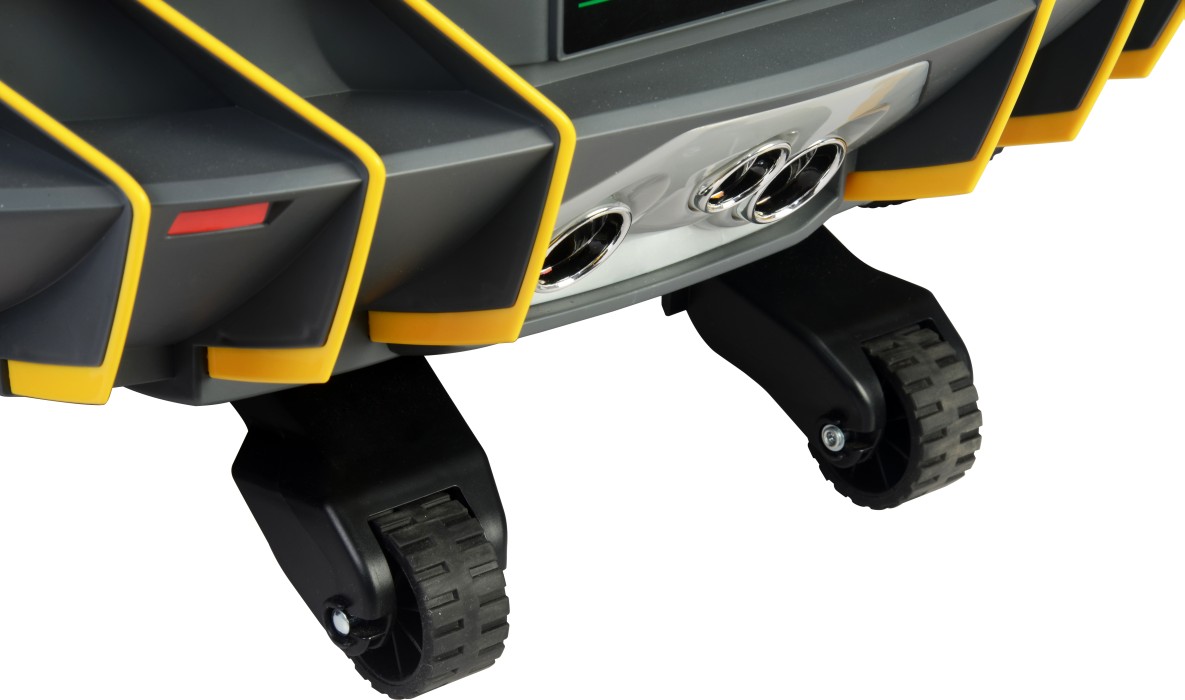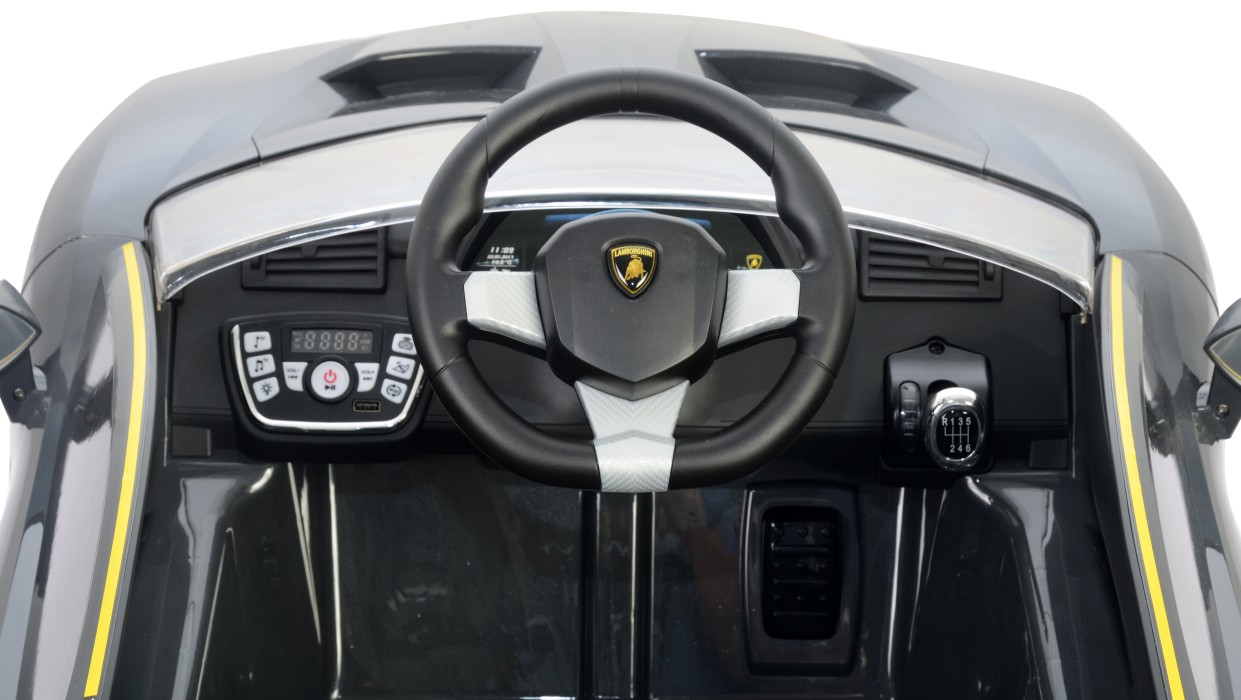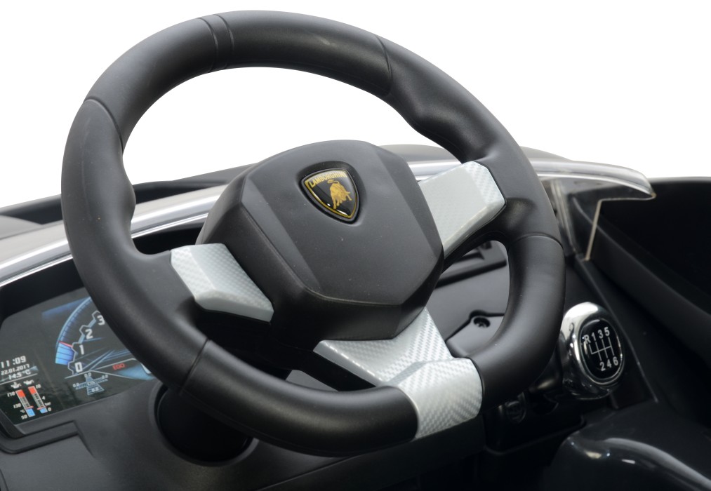 En riktigt tuff elbil från Lamborghini med fjärrkontroll. Batteriet är 12 volt. På instrumentbrädan finns ledlampor som visar hur laddat batteriet är. Bilen går att köra cirka 1,5-2 timmar på en laddning. Det tar cirka 10 timmar att ladda batteriet fullt. Bilen kan även köras på gräs och andra svåra underlag då motorn är så stark.