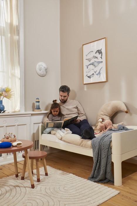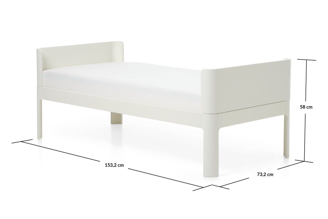 Med en elegant huvud- och fotgavel samt en enkel och tidlös design, skapas en atmosfär av lugn och avkoppling. De små men noggrant genomtänkta detaljerna, såsom de fina sammanfogningarna och bågen på benen, ger sängen en vänlig och harmonisk karaktär. Dess flexibilitet gör att den enkelt kan kombineras med andra designobjekt, leksaker och dekorativa föremål i både barnrummet och resten av hemmet.