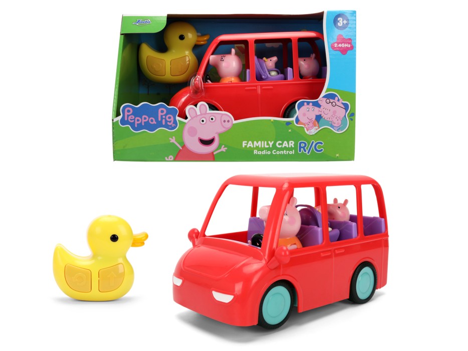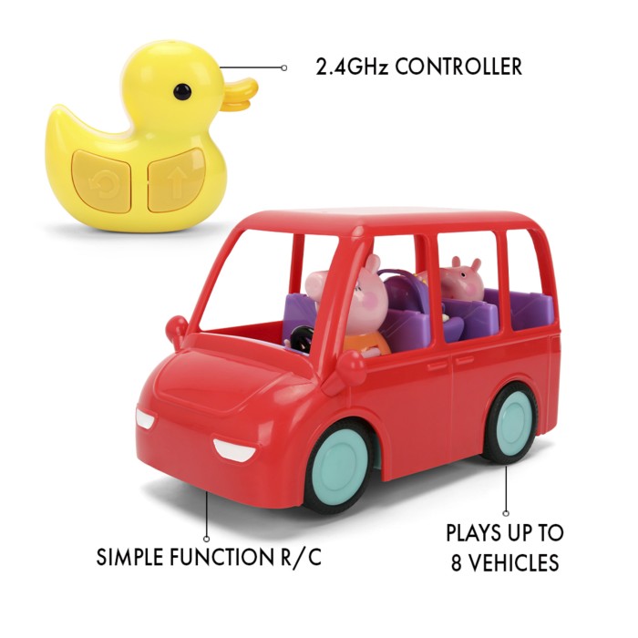 Radiostyrd familjebil från Greta Gris med färgglad och lekfull design. Bilen innehåller tre fasta figurer från Greta Gris-världen och styrs enkelt med en fjärrkontroll formad som en anka.