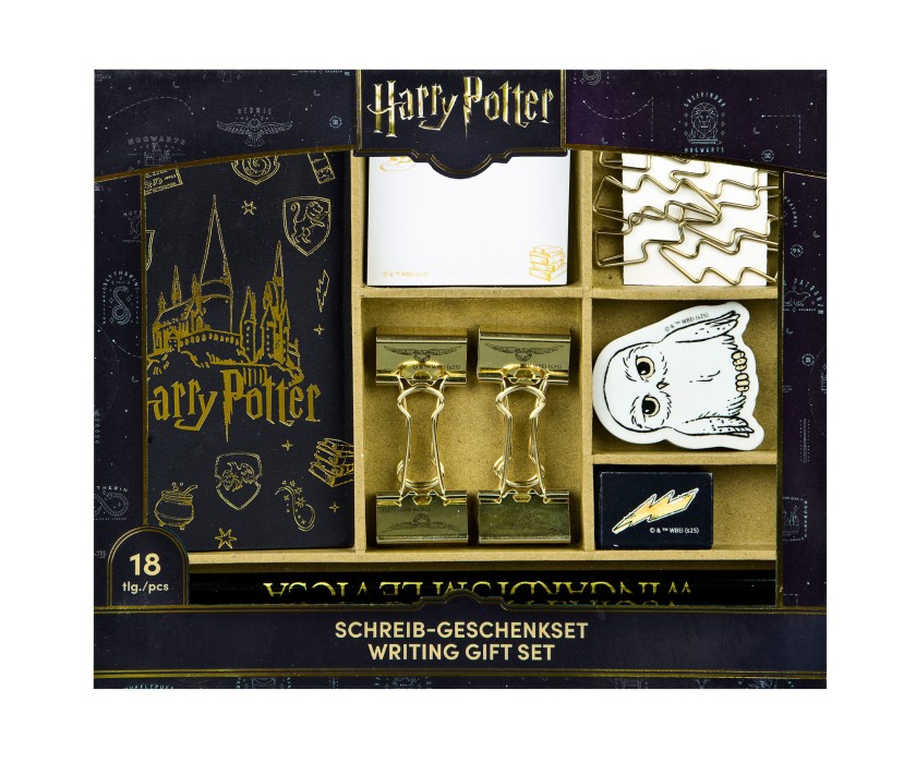 Detta 18-delars skrivset innehåller en mini-anteckningsbok, fyra blyertspennor, en pennvässare, sudd, klisterlappar, fyra gem och fyra klämmor. Setet är perfekt för skola, arbete eller för att skapa magiska anteckningar.