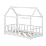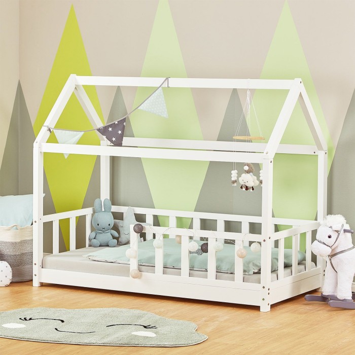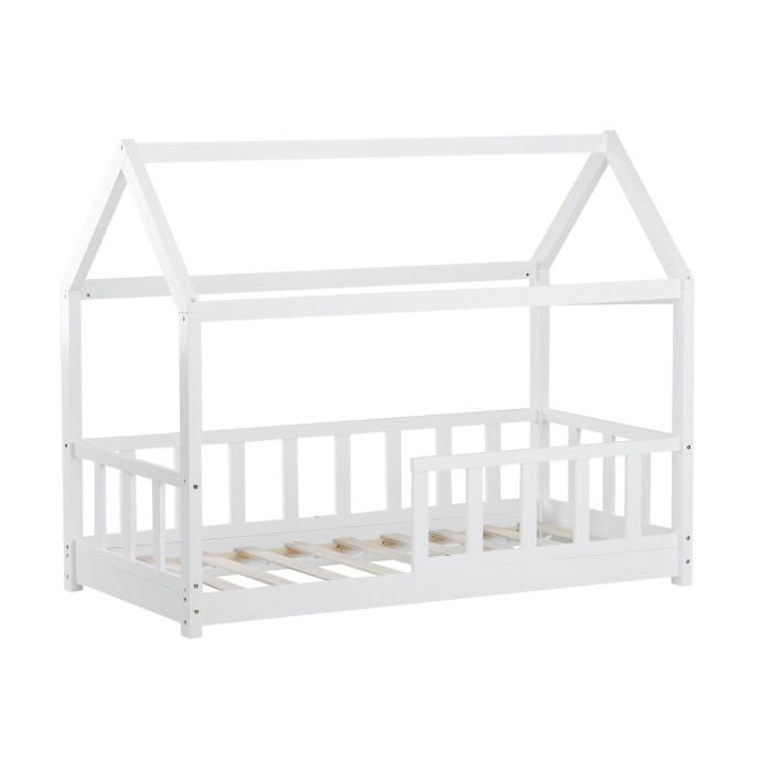Vitmålad barnsäng från Homestyle i massiv furu med träribbor och stolpar som tillsammans gör att den ser ut som ett hus. En perfekt sov- och lekplats för barn som även kan dekoreras med exempelvis ljusslingor eller tygpaneler!