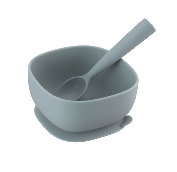 Denna silikonskål har en sugpropp som håller den stadigt på plats och minimerar spill. Skålen och den medföljande skeden tål både diskmaskin och mikrovågsugn, vilket gör den enkel och praktisk att använda.