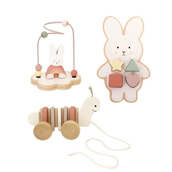 De mjuka pastellfärgerna och de bedårande figurerna gör detta till en fin gåva vid dop, ettårskalas eller babyshower. Leksakerna är designade för att främja barnets motorik, problemlösning och fantasi på ett tryggt och lekfullt sätt.