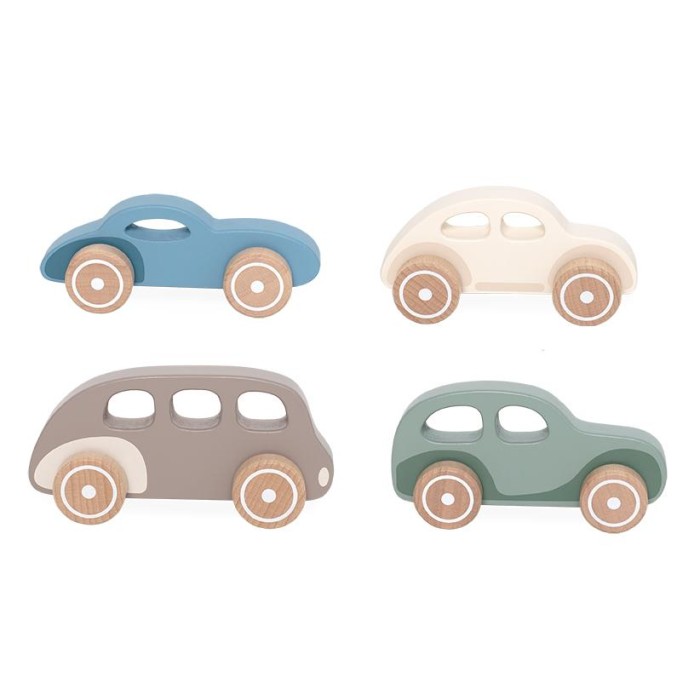 Denna presentask innehåller fyra träbilar i härliga naturfärger, idealiska för att skapa spännande tävlingar och äventyr. Bilarna har robusta hjul som gör det lätt att köra dem på både släta och ojämna ytor. Med fyra olika bilar i varierande färger erbjuder setet mångsidig lek som inspirerar till kreativt tänkande och motorisk utveckling.
