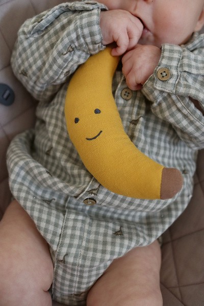 Vem har sagt att bananer bara är för apor? Denna färgglada bananformade skallra är ett roligt tillskott i bebisens leksakssamling. Den är speciellt designad för små händer och hjälper till att stimulera barnets greppförmåga och sinnen med både form och ljud. Perfekt för lekstunden eller som en spännande leksak att utforska i vagnen eller vid spjälsängen.
