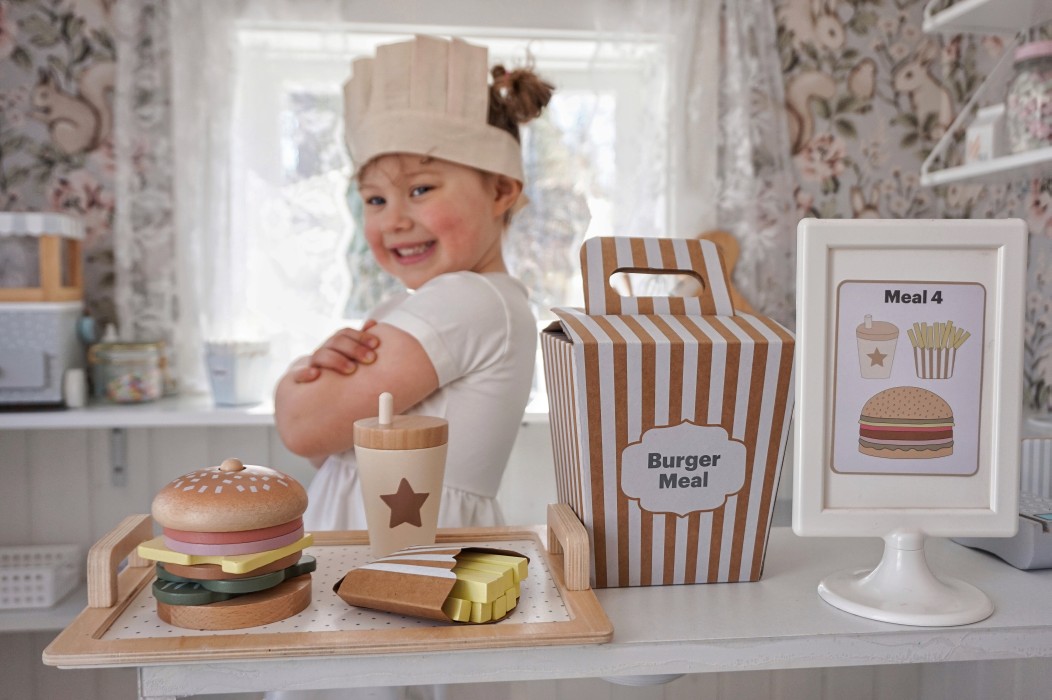 Komplett hamburgermeal från Jabadabado som uppmuntrar till kreativ lek. Hamburgaren är stapelbar och barnet sätter själv ihop den perfekta menyn med hjälp av fyra medföljande menykort.