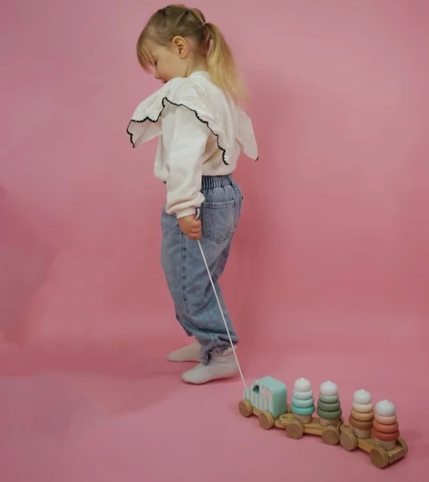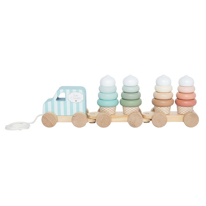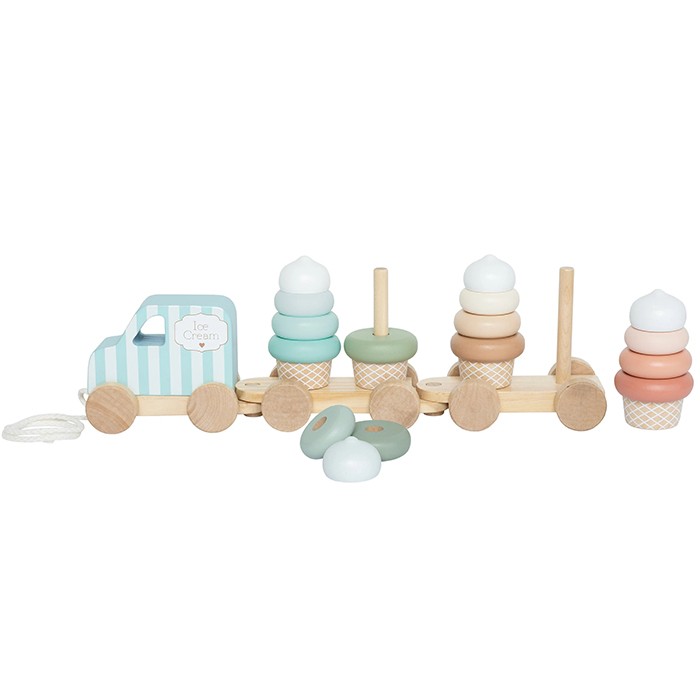 - Innehåller: 4x stapelbara glassar i pastellfärger, 1x dragbart släp med snöre