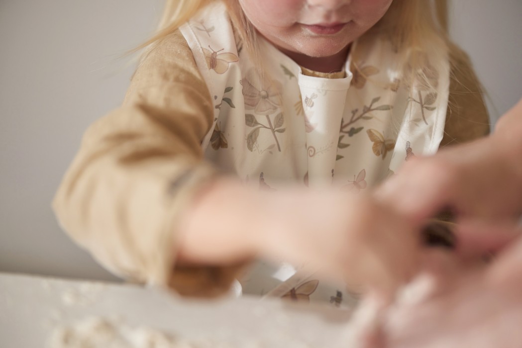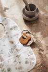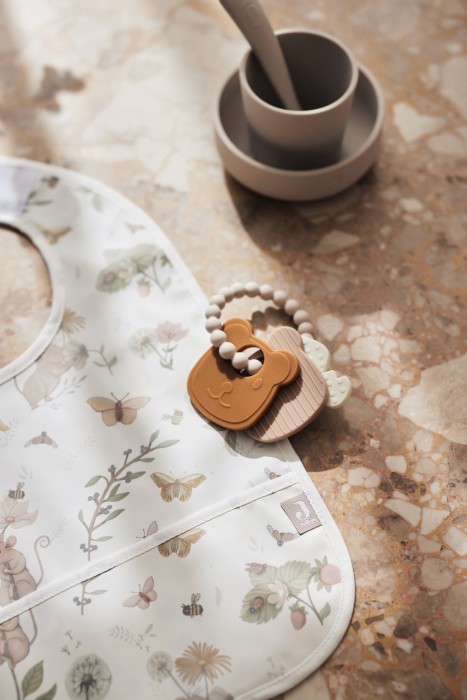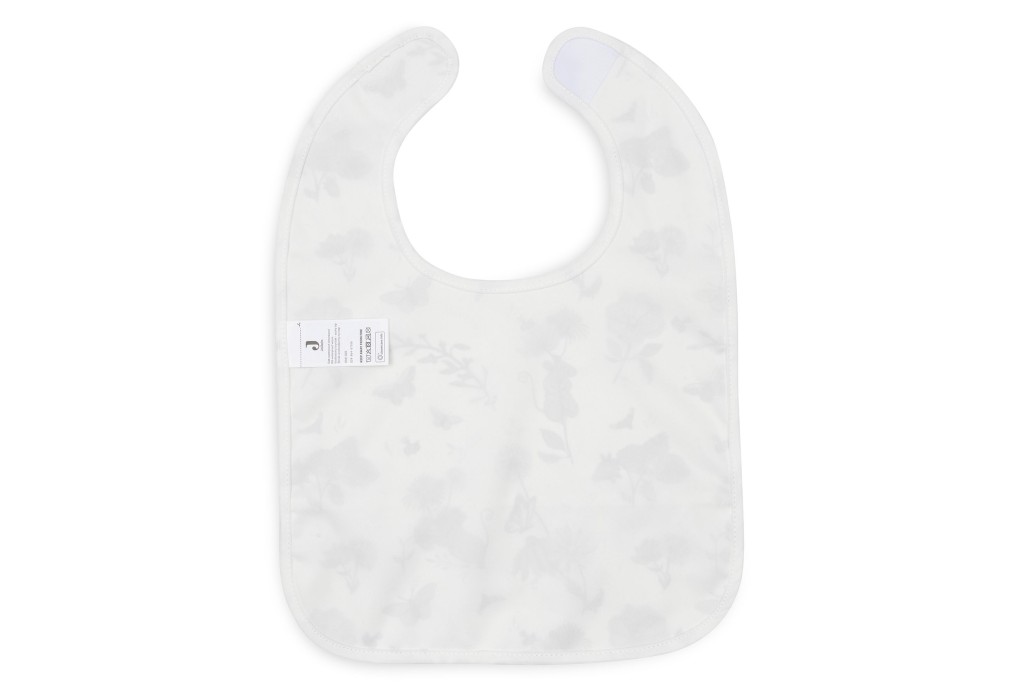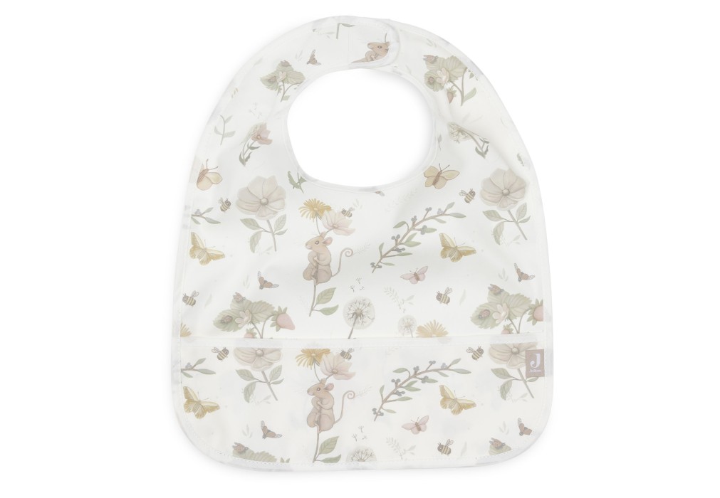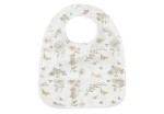 Jollein haklapp med gulligt tryck, tillverkad i mjukt, vattentätt material med en spillficka som fångar upp matrester och håller kläderna rena. Haklappen försluts i nacken med hjälp att ett justerbart kardborrband och är den enkel att ta på och av. Lätt att rengöra med en fuktig trasa eller i maskin.