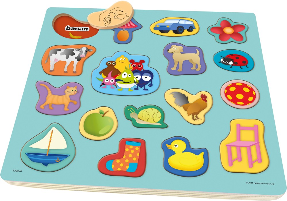 Pusslet har 17 tjocka bitar som är lämpliga för små händer och läggs enkelt i en stabil ram. Varje pusselbit är dekorerad med en Babblarna-figur och innehåller både ordet, en bild och teckenspråksbilden för att hjälpa till att förstärka språkutvecklingen. Detta pussel gör lärandet av ord och teckenspråk både interaktivt och underhållande, vilket gör det till en perfekt aktivitet för förskolebarn.