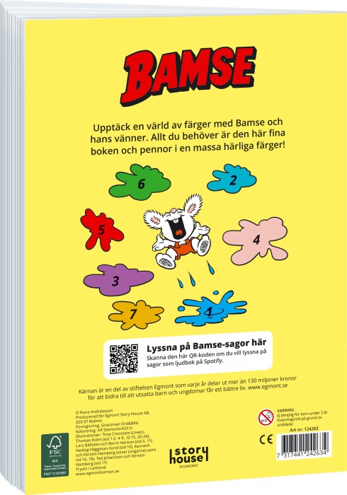 Färglägg bilderna med hjälp av siffror och lär dig både färgerna och hur man följer enkla instruktioner. Följ med Bamse och hans vänner genom 24 sidor av härligt målande och upptäck världen av färger på ett kreativt sätt! Perfekt för barn som vill kombinera lärande med rolig lek och utveckla sina motoriska färdigheter. Denna bok erbjuder en underhållande aktivitet som passar alla små Bamse-fans.