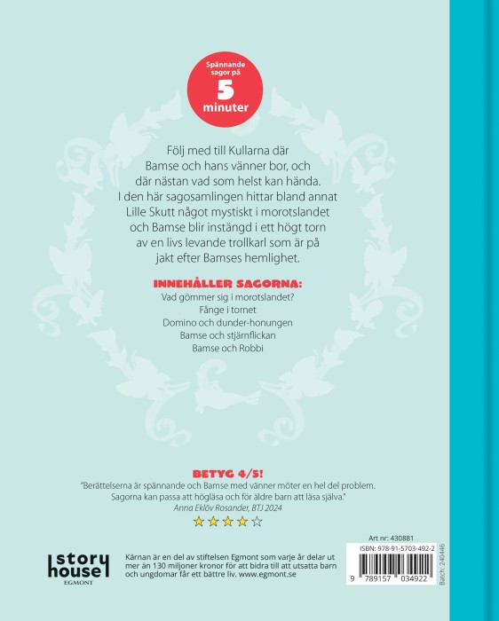 En fin sagosamling som både underhåller och lär ut viktiga värderingar om vänskap, mod och hjälpsamhet. Perfekt för barn som älskar Bamses värld!