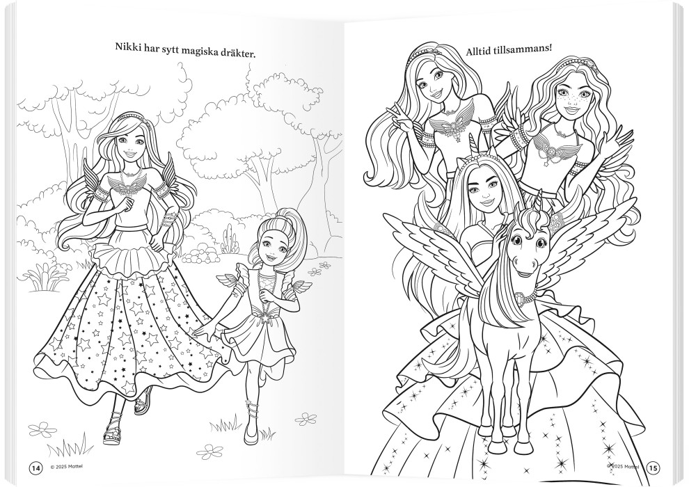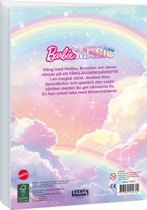 Kärnan Barbie A Touch of Magic Målarbok bjuder in barnen att följa med Malibu, Brooklyn och deras vänner på ett färgläggningsäventyr i en magisk värld.