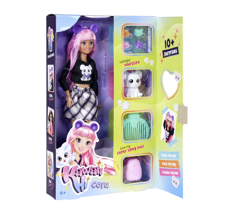 Upptäck Kawaii Hi Cora, en charmig och fullt rörlig mode-docka som snabbt blir en favorit hos barn. Med sitt eleganta hår som kan stylas på olika sätt bjuder Cora in till timmar av kreativ och fantasifull lek. Dockan levereras med en söt djurvän och över 9 roliga tillbehör som gör leken ännu mer spännande och variationsrik. Perfekt för barn som älskar mode, dockor och att skapa egna berättelser och äventyr.