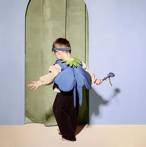 En blå väst, blå vingar och ett blåbär på huvudet – det här är kostymen för barn som vill förvandla leken till ett sagoskogsäventyr. Västen har rundad framkant, krage med gröna blad och små vadderade vingar på ryggen. I setet ingår också ett hårband med ett blåbär som dekoration och en matchande trollstav. Kanske för att strö lite blåbärsmagi över leken? Samla på låtsasbär i en påhittad skog eller hitta på egna små sagor där blåbär spelar huvudrollen.