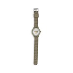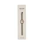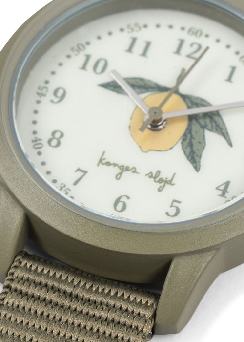 Tydlig och pedagogisk barnklocka från Konges Slöjd med markeringar för timmar och 5-minutersintervall. Utrustad med tre visare, mjukt tygarmband och justerbart spänne i stål.