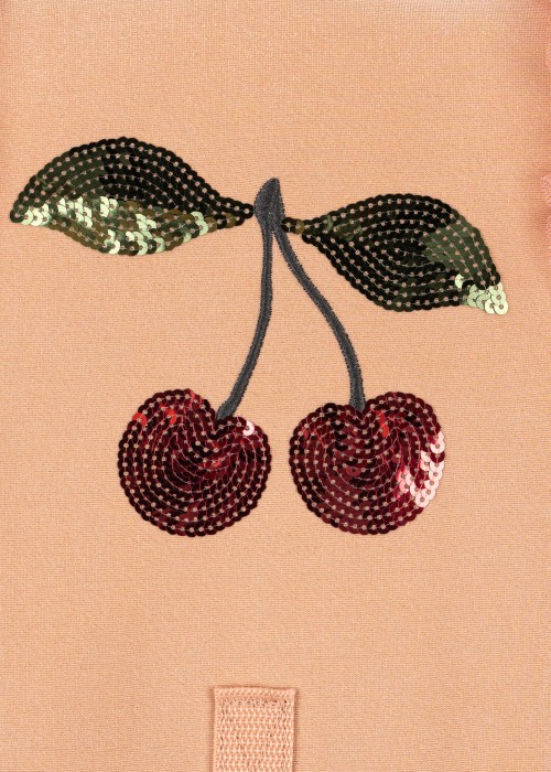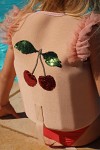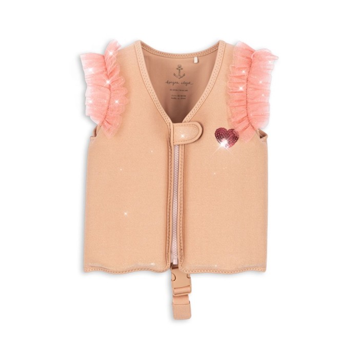 Fin, glittrig simväst från Konges Slöjd med en liten volangkant och körsbärsmotiv med paljetter. Simvästen är ett praktiskt flythjälpmedel för både lek och siminlärning.