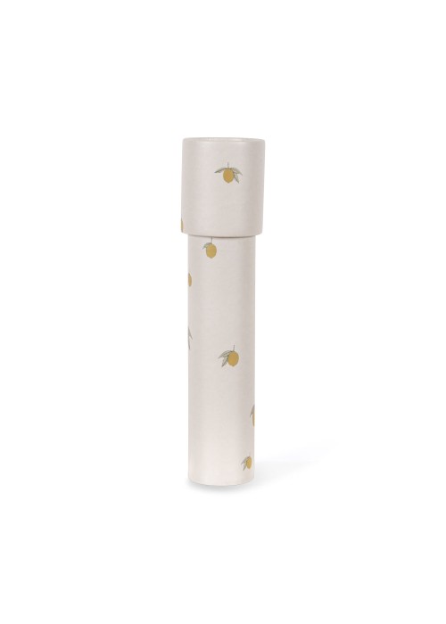 Med pärlor inuti och ett gullit citron motiv är detta kalejdoskop en visuell fest för barn. Genom att titta inuti kan barnet uppleva en magisk värld av skiftande mönster och färger skapade av speglingarna från speglarna inuti. Kalejdoskopet är en spännande och stimulerande leksak som inspirerar till kreativitet och utforskning.