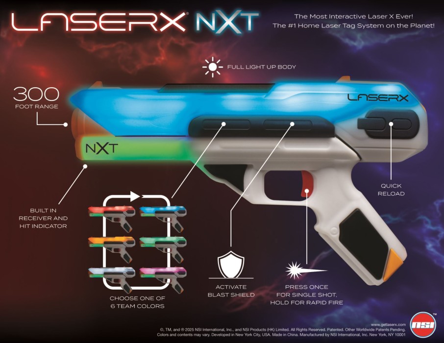Setet har ljud- och ljuseffekter, precisionslaser och interaktiv spelupplevelse som gör varje träff kännbar och varje runda oförglömlig. Med LaserX NXT kan ni spela 1 mot 1 eller i lag, och utrustningen är kompatibel med andra LaserX-set – perfekt för att utöka spelet med fler spelare!