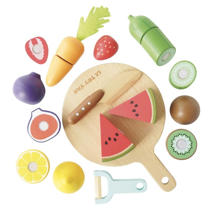 Låt de unga kockarna laga sina egna "måltider" med Le Toy Van Skärbräda och Leksaksmat. Detta fantastiska set innehåller en skärbräda, en kniv, en skalare och 18 stycken realistiska kardborrebitar av frukt och grönsaker som melon, citron, kiwi, morot och mer.